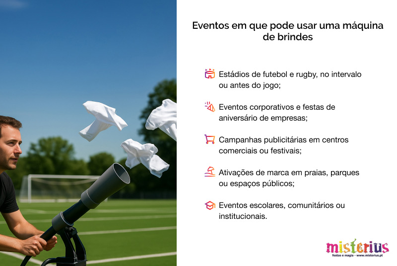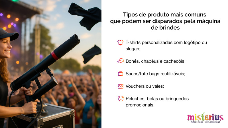 Este equipamento permite lançar brindes personalizados para o público e criar uma experiência inesperada e memorável. Mais do que uma oferta, transforma-se num momento de celebração e de entusiasmo para os participantes.